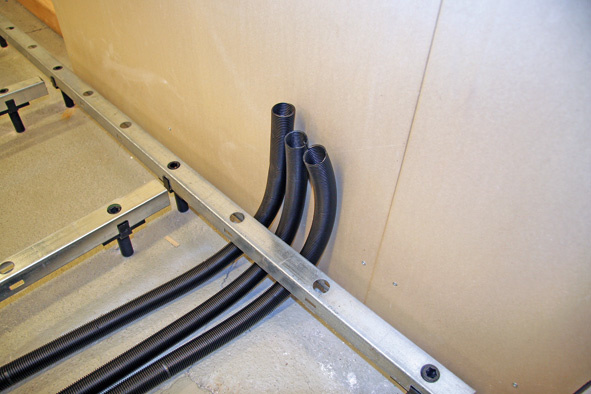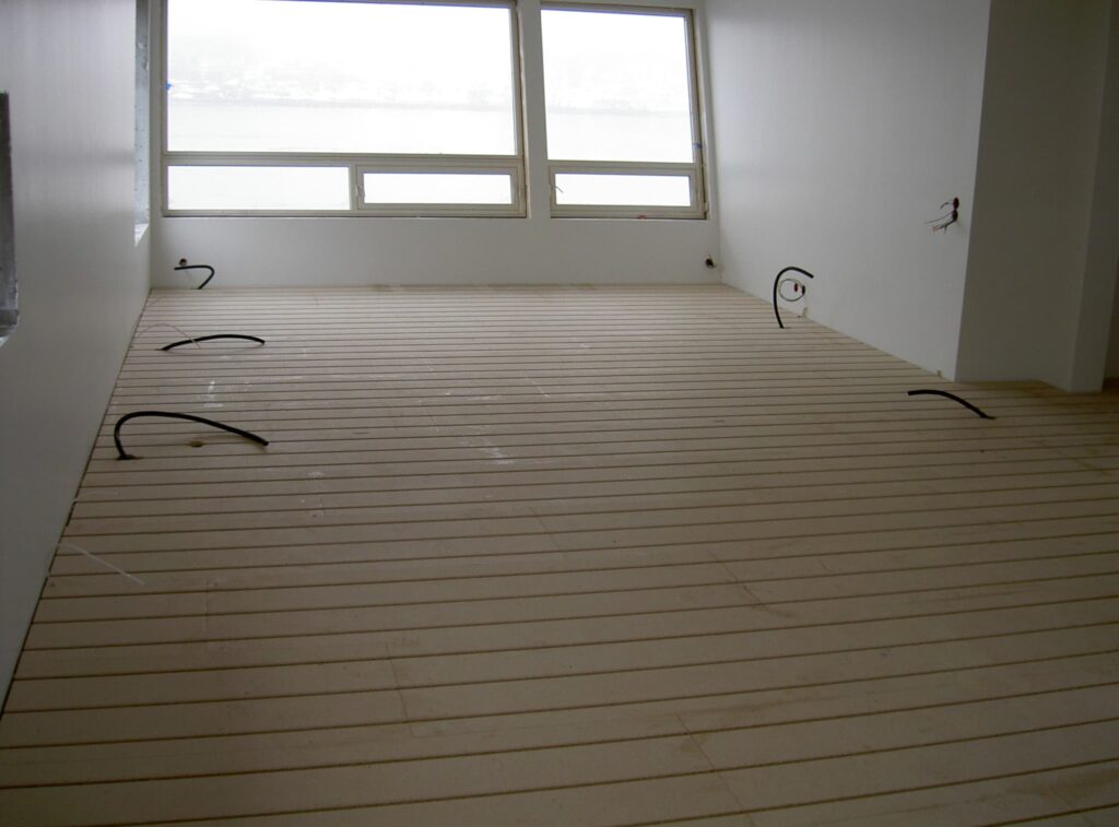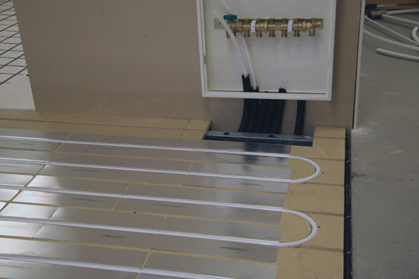 Utrymmet mellan golvskivorna och bjälklaget ger stora möjligheter för enkel installation av golvvärmesystem. Tur- och returör från golvvärmefördelare kan enkelt dras i detta utrymme utan att påverka systemets ljudisolerande egenskaper. Denna flexibla ledningsdragning är en av de stora fördelarna med Granabs golvregelsystem och gör installationen både snabb och effektiv.