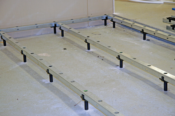 Installationsgolv från Granab installeras direkt på råbjälklaget utan våta ytavjämningar. Detta ger ett snabbt montage som minskar byggtiden avsevärt. Du slipper kemiska tillsatser och långa uttorkningstider. Systemet använder formstabila golvreglar av förzinkat stål eller LVL-träbalk tillsammans med ett effektivt ljuddämpande fjädringssystem. Detta gör installationen både enkel och effektiv.